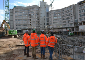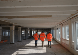 Drie medewerkers van Bosman BAM Combinatie (BBC) in oranje veiligheidsjassen op de bouwplaats van de grootschalige revitalisatie van het ABN AMRO-kantoor aan de Foppingadreef in Amsterdam.