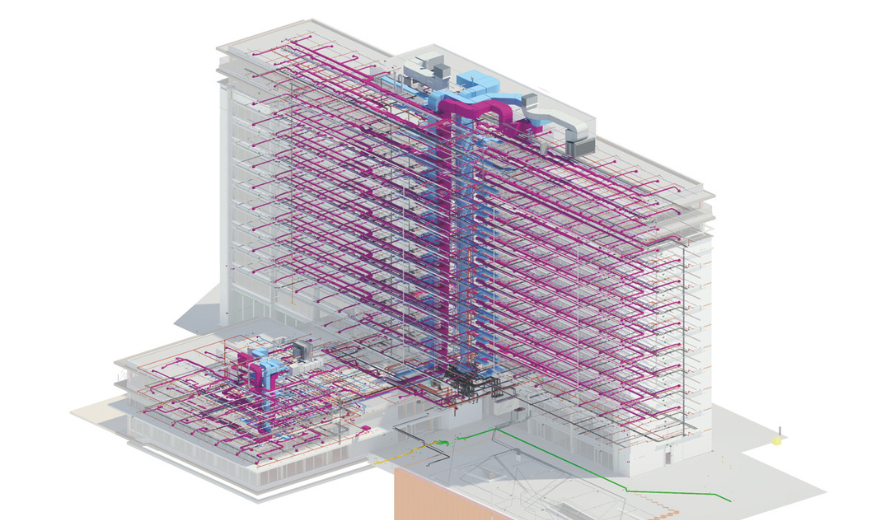 “We hebben uitvoerig bekeken en onderzocht of en welke installaties konden worden hergebruikt, omdat dat duurzamer is dan alles vervangen. Helaas bleken de installaties niet geschikt en hebben we toch gekozen voor een volledige vernieuwing nadat uit het 3D-model bleek dat de constructie voldoende ruimte bood voor onder andere de routing. De hoge duurzaamheidseisen vragen bijvoorbeeld om grotere luchthoeveelheden en dus om grotere luchtkanalen.”