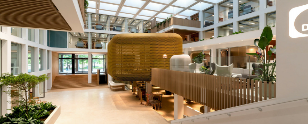 Een uniek aspect van dit project is het hartvormige gedeelte, ontworpen door Fokkema & Partners Architecten, waar collega’s samenkomen om te lunchen of vergaderen. Een bijzondere toevoeging aan het kantoor, wat het project esthetisch en installatietechnisch interessant maakte. In dit gedeelte is het oorspronkelijke klimaatplafond verwijderd om plaats te maken voor een combinatie van latten- en doekplafonds. De koeling en verwarming in dit gedeelte worden nu verzorgd door fancoil units. Ook is er speciale verlichting geïnstalleerd om een gezellige sfeer te creëren door het geheel mooi op te lichten.